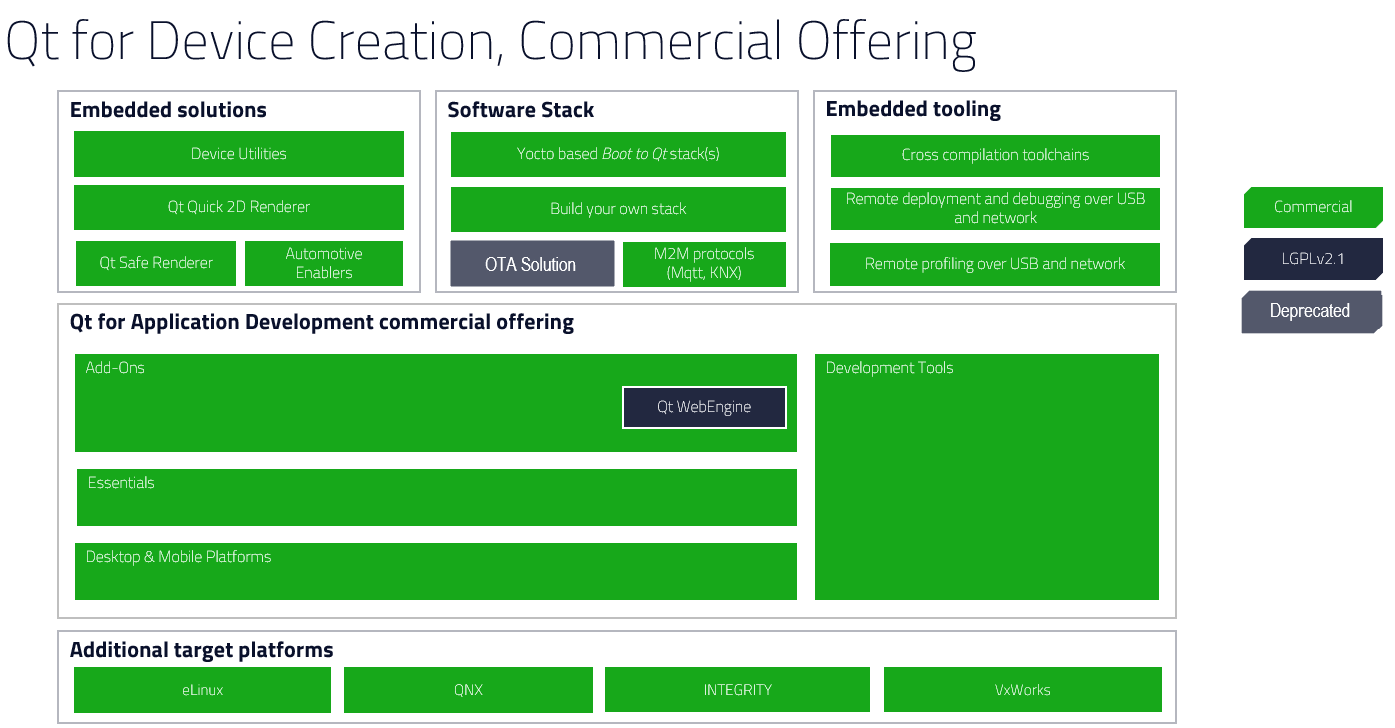Qt for Device Creation is a commercial offering that provides the Qt development framework for multiple embedded platforms: embedded Linux, QNX, INTEGRITY, and VxWorks.