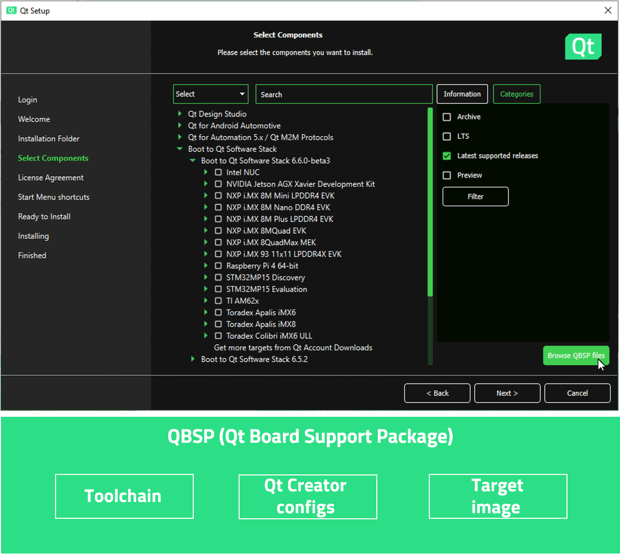 Qt Board Support Package (QBSP) provides needed components for using Qt on an embedded device. QBSPs are installed using Qt online installer, either from online content or from separately downloaded .qbsp file.