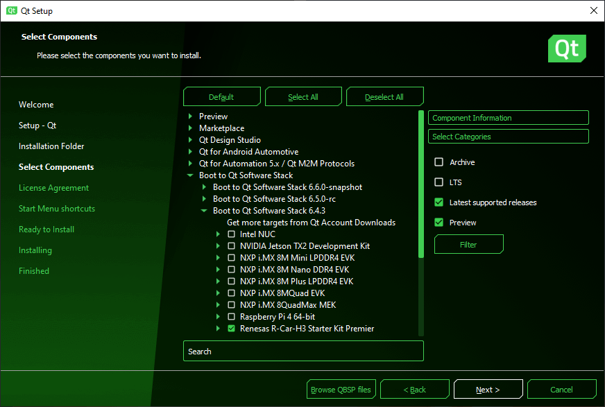 Once you have built the QBSP for your host, use the Qt online installer to continue the installation process.