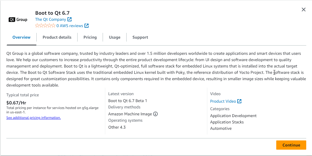For use on Amazon Elastic Compute Cloud (EC2), a Boot to Qt image has been created targeting the Graviton ARM processor core used by AWS. This image is packaged as an Amazon Machine Image (AMI) file that is available for deployment from the AWS Marketplace.