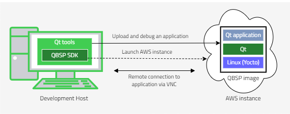 This virtual Qt target device can be used in the same manner as a physical hardware device; the full development tools suite from Qt can be used for design, development and testing of applications on the AWS cloud.