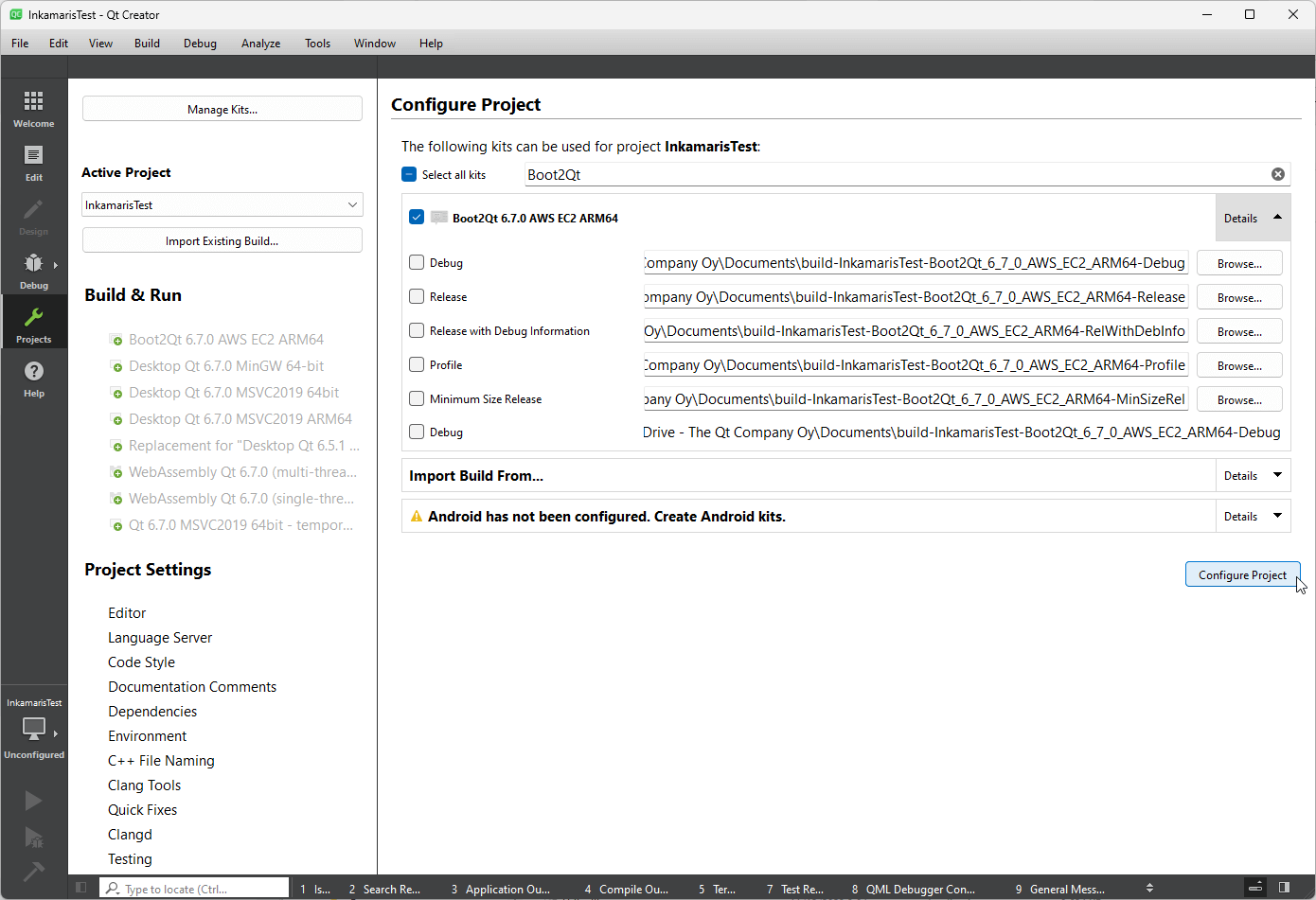 - Creating a project in Qt Creator and using a Qt Board Support Package (QBSP) for the AWS Graviton instance.