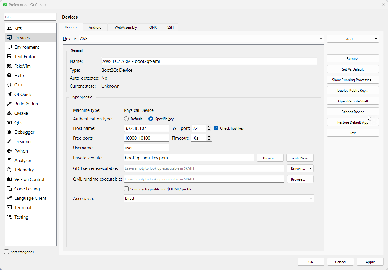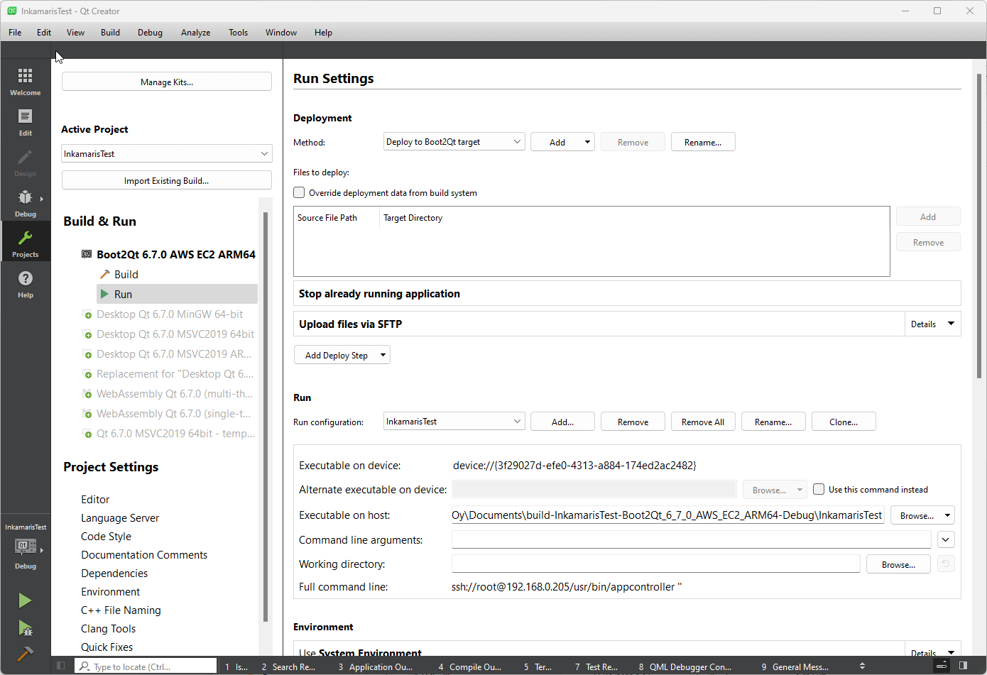 Note: Qt Creator uploads the application over the IP network, so the AWS Graviton device has to be in the same network as your development host PC.
