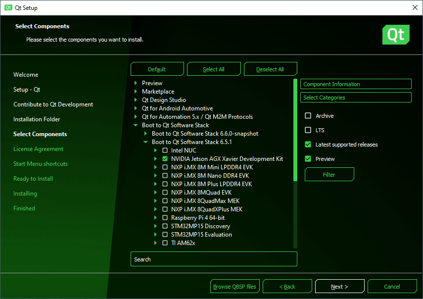 - Continue to Select Components and open the top-level Boot to Qt Software Stack dropdown menu.