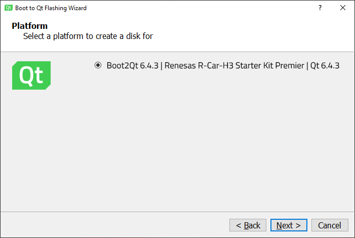 Before flashing the Boot to Qt image to a microSD card, make sure that the target device is compatible with Boot to Qt. Use the firmware files included in the QBSP to update the target device. For detailed instructions, see R-Car H3SK flashing firmware.