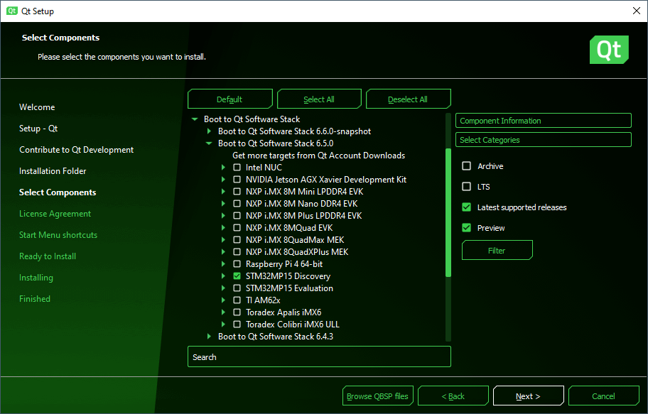 - Continue to Select Components and open the top-level Boot to Qt Software Stack dropdown menu.
