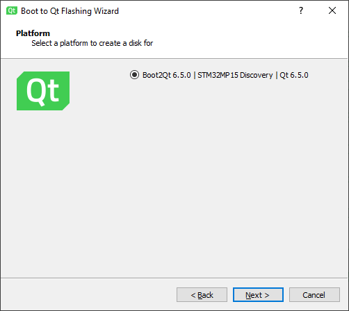The Boot to Qt image contains the Boot to Qt Software Stack for the STM32MP1 device. Flash the image to a microSD card as follows: