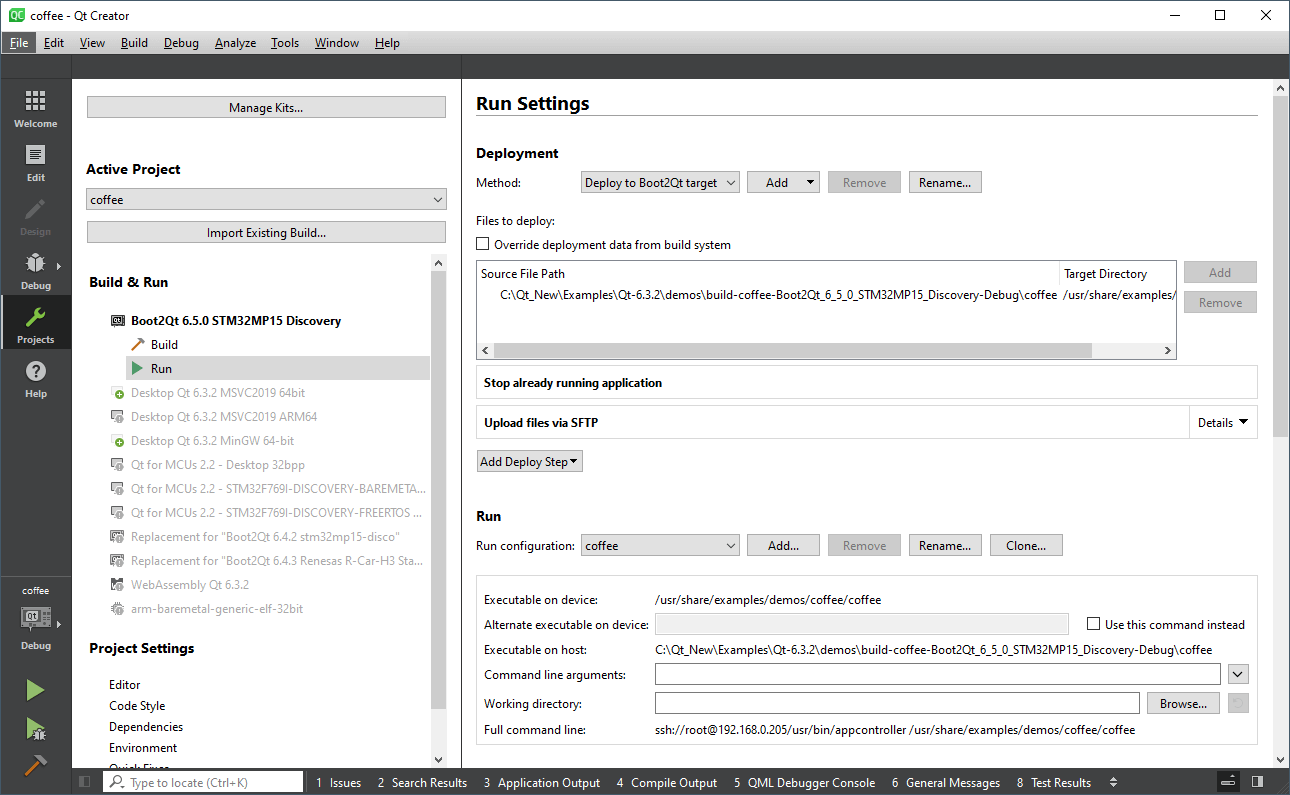 Note: Qt Creator uploads the application over the IP network, so the STM32MP1 device has to be in the same network as your development host PC.