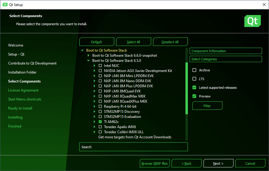 - Continue to Select Components and open the top-level Boot to Qt Software Stack dropdown menu.
