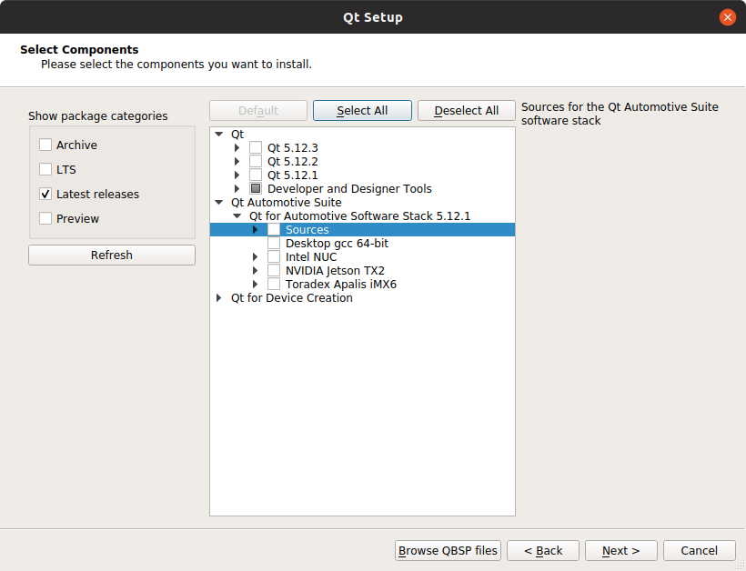 - Under Qt Automotive Suite, there are Qt for Automotive Suite software stacks available. Select a stack, then select the components and your hardware. In a minimal setup, you need to select Desktop gcc 64-bit, at least. A desktop build of a related Qt version is included with this selection, along with Qt Creator. If you want to test on a target device, select one or more target hardware options.