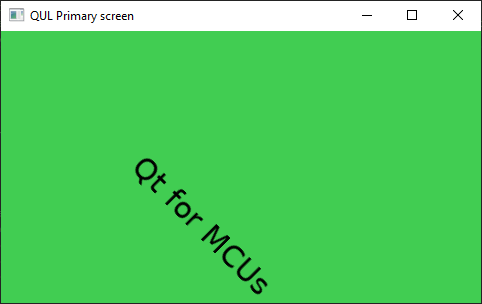 Rectangle { color: "#41CD52" Text { anchors.centerIn: parent font.pixelSize: 30 text: "Qt for MCUs" transform: Matrix4x4 { property real a: Math.PI / 4 matrix: Qt.matrix4x4(Math.cos(a), -Math.sin(a), 0, 0, Math.sin(a), Math.cos(a), 0, 0, 0, 0, 1, 0, 0, 0, 0, 1) } } }