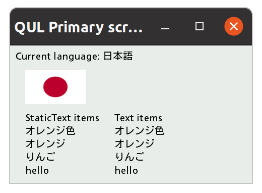 By tapping the screen, user is able to switch between available languages (english, norwegian, latvian, japanese, arabic, thai). Changing the application language updates the flag image, and the Text and StaticText items. Only StaticText renders complex scripts correctly with the static font engine.