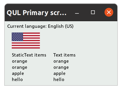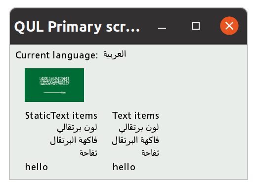 StaticText { width: staticTextItemsTitle.width text: qsTr("orange", "fruit") } StaticText { width: staticTextItemsTitle.width text: qsTr("apple") } StaticText { width: staticTextItemsTitle.width text: qsTr("hello") } }