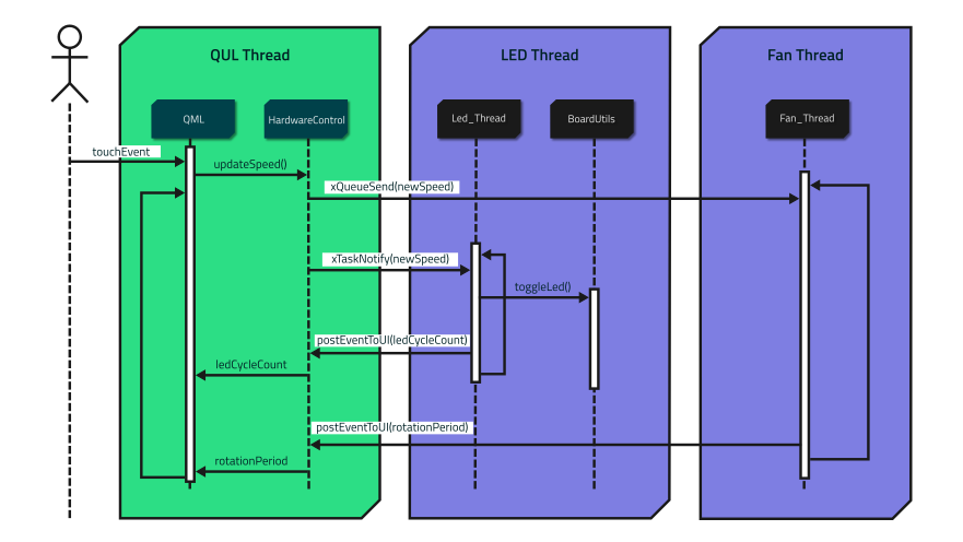 The sequence diagram below summarizes how an event from the QML appöication affects the background thread that is in charge of the hardware.