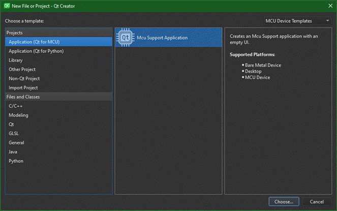 - Choose the Application (Qt for MCU) > MCU Support template.