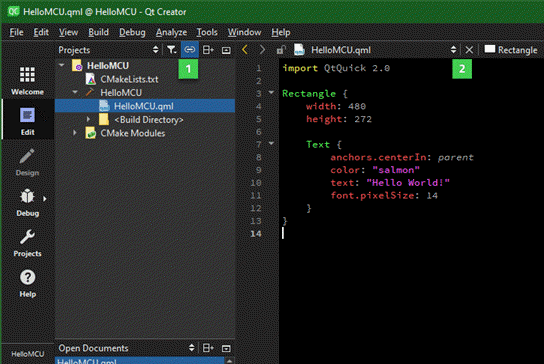 Notice that the project explorer (1) lists all the files created by the wizard, including the HelloMCU.qml file. The code editor view (2) shows the contents of the QML file, which contains a Rectangle with a Text item in it.