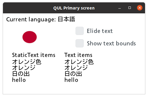 StaticText { width: root.textMaxWidth text: qsTr("orange", "fruit") } StaticText { width: root.textMaxWidth text: qsTr("sunrise") } StaticText { width: root.textMaxWidth text: qsTr("hello") } }