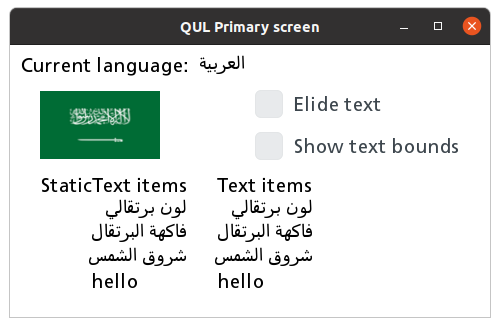 By tapping the screen, user is able to switch between available languages (english, norwegian, latvian, japanese, arabic, thai). Changing the application language updates the flag image, and the Text and StaticText items. Only StaticText renders complex scripts correctly with the static font engine.
