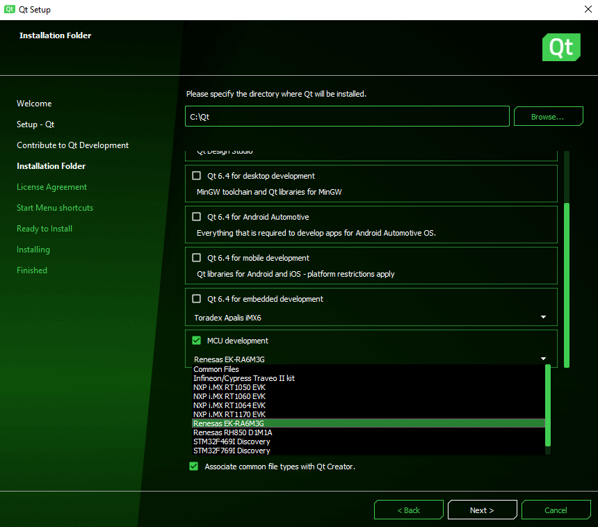 Install the common prerequisites using the Qt online installer, which is available for download from your Qt account. Use the pre-made MCU development installation preset and select Renesas EK-RA6M3G in Qt online installer: