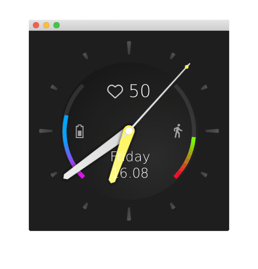 The watch example demonstrates a wearable application built with Qt Quick Ultralite. It uses QML with some basic C++. It is intended to be used on devices with small displays with touch support. In addition, it performs basic gesture recognition which the demo uses to switch between different watch shields.