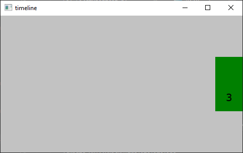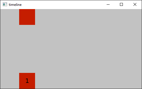 The timeline example shows how to use the Timeline type. It displays a cyclic animation of two rectangles that change colors from red to green, while moving from left to right. It then stops the color animation and moves the rectangles towards the vertical center. After a while, the animations are played in reverse and at the end of this animation the cycle is restarted.
