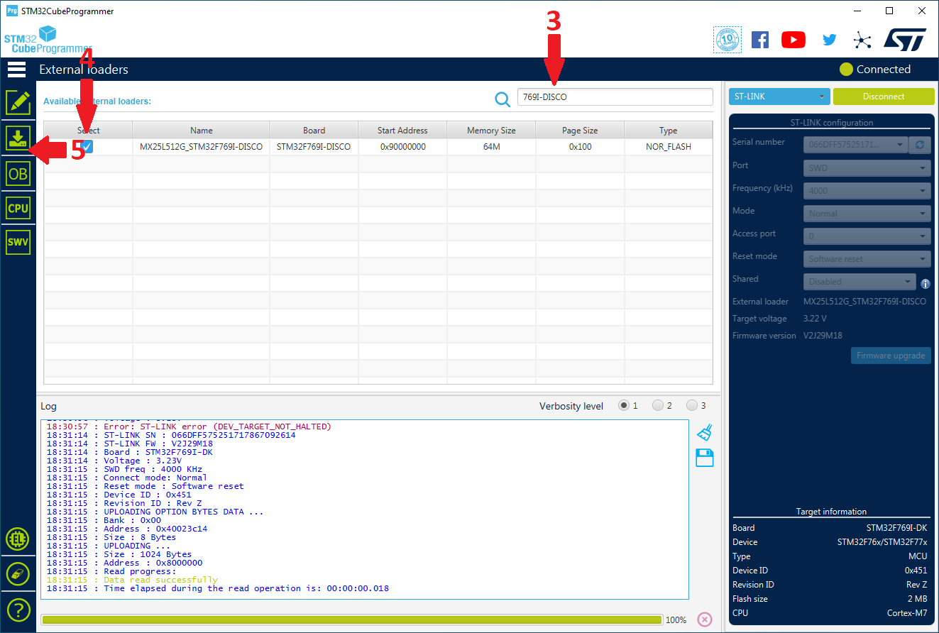 4. Choose an appropriate external loader script (for example, MX25L512G_STM32F769I-DISCO)