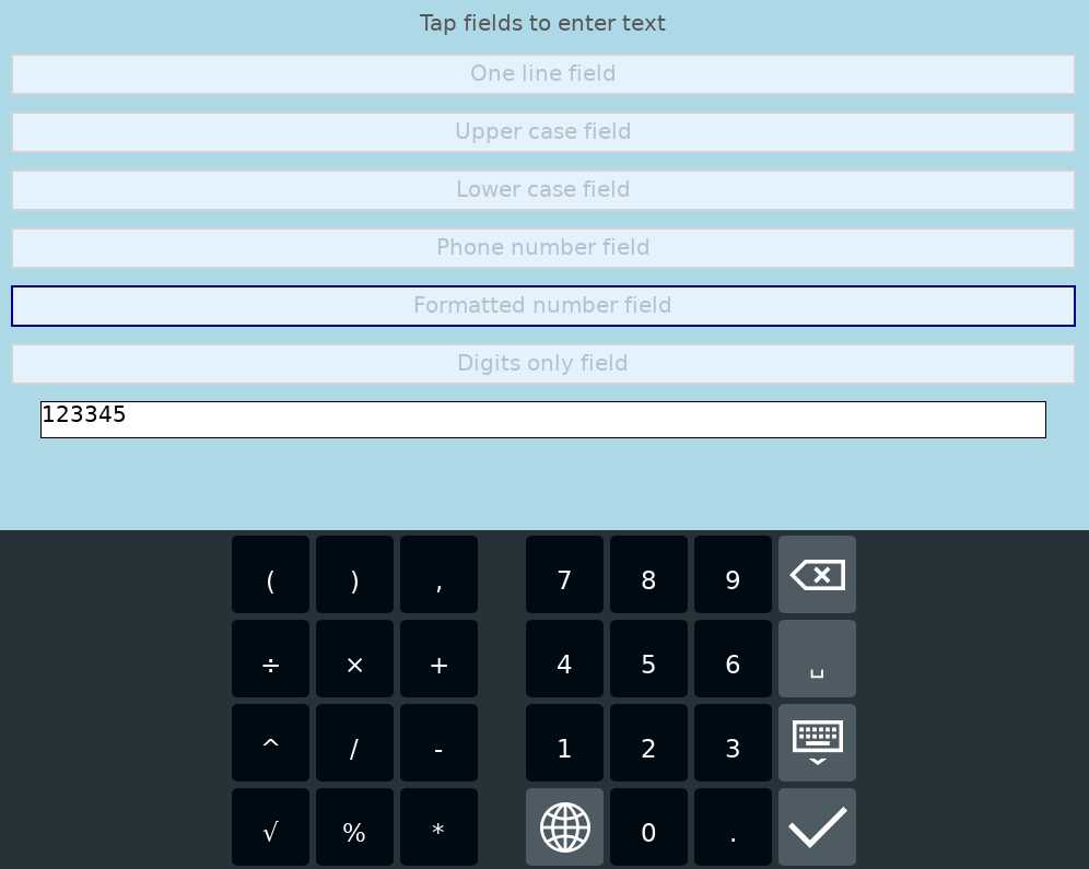 CustomTextField { width: parent.width placeholderText: "One line field" enterKeyAction: EnterKeyAction.Next onAccepted: upperCaseField.focus = true } CustomTextField { // ### FIXME - the ShiftKey in default style should get // StyleConfig.capsLockKeyAccentColor color. But state change // for some reason is not triggered in ShiftKeyPanel.qml, even // when InputContext.capsLockActive == true. Bug in 'state' // handling system? id: upperCaseField width: parent.width placeholderText: "Upper case field" inputMethodHints: Qt.ImhUppercaseOnly enterKeyAction: EnterKeyAction.Next onAccepted: lowerCaseField.focus = true } CustomTextField { id: lowerCaseField width: parent.width placeholderText: "Lower case field" inputMethodHints: Qt.ImhLowercaseOnly enterKeyAction: EnterKeyAction.Next onAccepted: phoneNumberField.focus = true } CustomTextField { id: phoneNumberField width: parent.width placeholderText: "Phone number field" inputMethodHints: Qt.ImhDialableCharactersOnly enterKeyAction: EnterKeyAction.Next onAccepted: formattedNumberField.focus = true } CustomTextField { id: formattedNumberField width: parent.width placeholderText: "Formatted number field" inputMethodHints: Qt.ImhFormattedNumbersOnly enterKeyAction: EnterKeyAction.Next onAccepted: digitsField.focus = true } CustomTextField { id: digitsField width: parent.width placeholderText: "Digits only field" inputMethodHints: Qt.ImhDigitsOnly enterKeyAction: EnterKeyAction.Search enterKeyEnabled: digitsField.text.length > 5 onAccepted: { textAreaTextItem.text = textAreaTextItem.text + "\n" + digitsField.text digitsField.clear() }