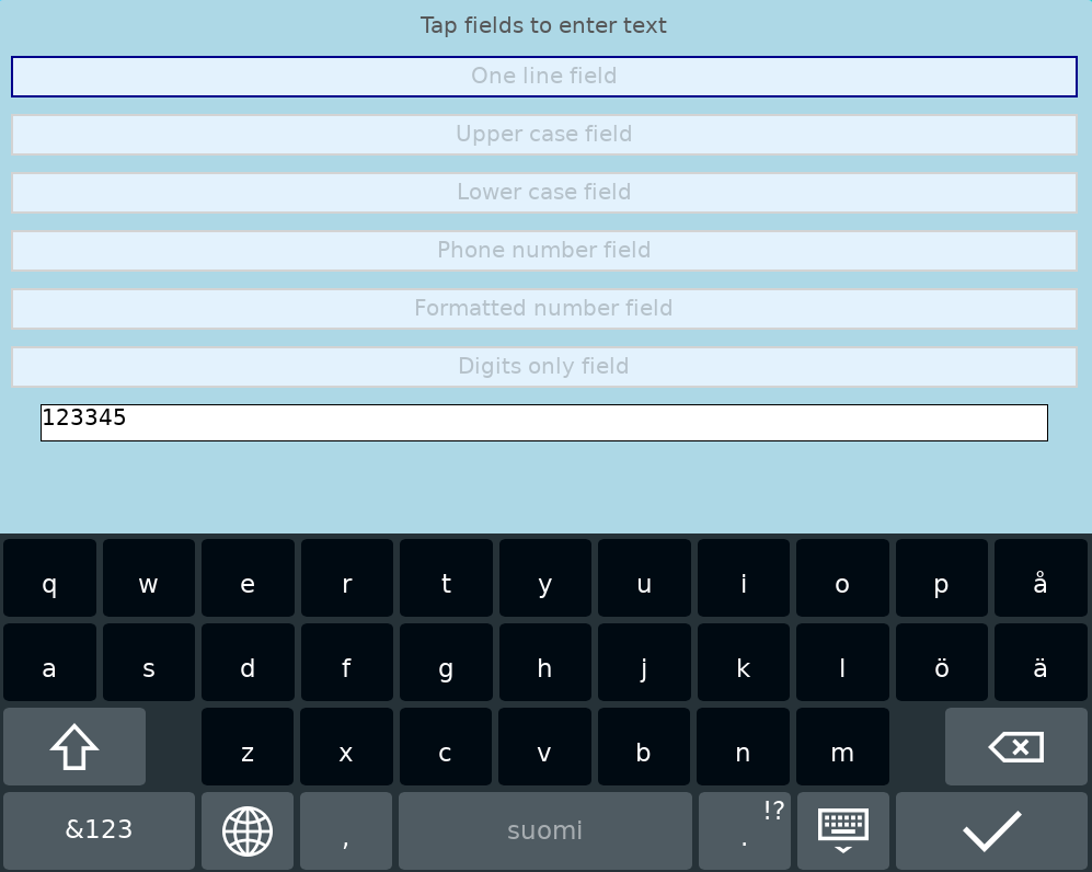 This example demonstrates how to use TextInput in combination with Qt Quick Ultralite Virtual Keyboard (InputPanel) and hardware key input. The application consists of six custom text input fields. The application content can be flicked.