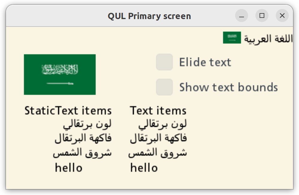 By tapping the screen, user is able to switch between available languages (english, norwegian, latvian, japanese, arabic, thai). Changing the application language updates the flag image, and the Text and StaticText items. Only StaticText renders complex scripts correctly with the static font engine.