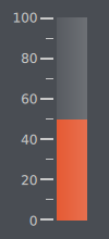 import QtQuick 2.2 import QtQuick.Controls 1.1 import QtQuick.Enterprise.Controls 1.3 import QtQuick.Enterprise.Controls.Styles 1.3 Rectangle { width: 100 height: 220 color: "#494d53" Gauge { value: 50 tickmarkStepSize: 20 minorTickmarkCount: 1 font.pixelSize: 15 anchors.centerIn: parent anchors.horizontalCenterOffset: -4 style: GaugeStyle { valueBar: Rectangle { color: "#e34c22" implicitWidth: 28 } foreground: null tickmark: Item { implicitWidth: 8 implicitHeight: 4 Rectangle { x: control.tickmarkAlignment === Qt.AlignLeft || control.tickmarkAlignment === Qt.AlignTop ? parent.implicitWidth : -28 width: 28 height: parent.height color: "#ffffff" } } minorTickmark: Item { implicitWidth: 8 implicitHeight: 2 Rectangle { x: control.tickmarkAlignment === Qt.AlignLeft || control.tickmarkAlignment === Qt.AlignTop ? parent.implicitWidth : -28 width: 28 height: parent.height color: "#ffffff" } } } } }