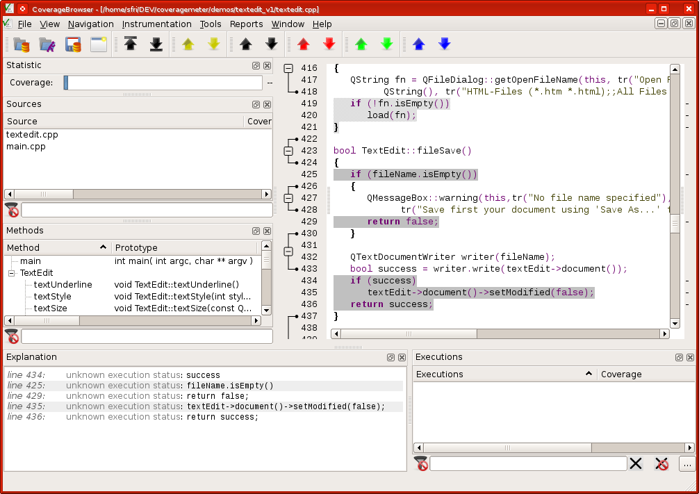 CoverageBrowser reveals, for example, that the TextEdit::fileSave() function is not executed. We will now validate this function interactively, guided by the code coverage analysis.