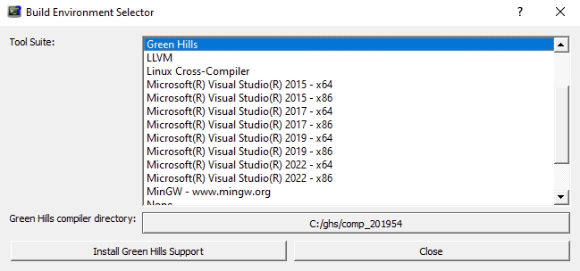 Initially, toolselector presents you with a list of different compilers. Selecting one shows you some buttons. One button allows you to choose a directory where that compiler is installed. If a valid location is set, you will see other buttons depending on which compiler is selected, such as Open Console, Create Console, or Install Support.