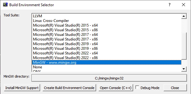 In the case of MinGW, the Create Build Environment Console, and Open Console buttons both have the side effect of performing an Install MinGW Support first, if necessary.