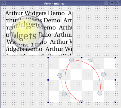 The specialized widgets used in the other demonstrations of the Arthur painting system are provided as custom widgets to be used with Qt Designer. Since each of the widgets provides a set of signals and slots, the effects they show can be controlled by connecting them up to standard input widgets.