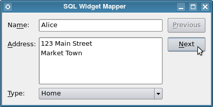 connect(previousButton, SIGNAL(clicked()), mapper, SLOT(toPrevious())); connect(nextButton, SIGNAL(clicked()), mapper, SLOT(toNext())); connect(mapper, SIGNAL(currentIndexChanged(int)), this, SLOT(updateButtons(int))); QGridLayout *layout = new QGridLayout(); layout->addWidget(nameLabel, 0, 0, 1, 1); layout->addWidget(nameEdit, 0, 1, 1, 1); layout->addWidget(previousButton, 0, 2, 1, 1); layout->addWidget(addressLabel, 1, 0, 1, 1); layout->addWidget(addressEdit, 1, 1, 2, 1); layout->addWidget(nextButton, 1, 2, 1, 1); layout->addWidget(typeLabel, 3, 0, 1, 1); layout->addWidget(typeComboBox, 3, 1, 1, 1); setLayout(layout); setWindowTitle(tr("SQL Widget Mapper")); mapper->toFirst(); }