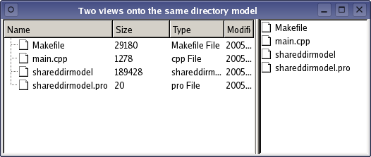 int main(int argc, char *argv[]) { QApplication app(argc, argv); QSplitter *splitter = new QSplitter; QFileSystemModel *model = new QFileSystemModel; model->setRootPath(QDir::currentPath()); QTreeView *tree = new QTreeView(splitter); tree->setModel(model); tree->setRootIndex(model->index(QDir::currentPath())); QListView *list = new QListView(splitter); list->setModel(model); list->setRootIndex(model->index(QDir::currentPath())); QItemSelectionModel *selection = new QItemSelectionModel(model); tree->setSelectionModel(selection); list->setSelectionModel(selection); splitter->setWindowTitle("Two views onto the same file system model"); splitter->show(); return app.exec(); }