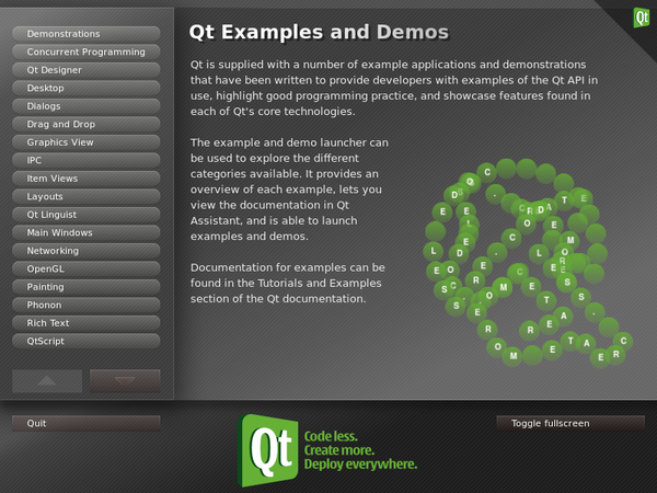 qtdemoicon on the desktop background or in the desktop start menu under the Programming or Development submenus. You can launch this application from this icon. Alternatively, you can enterqtdemoin a terminal window. - On Mac OS X, navigate to the