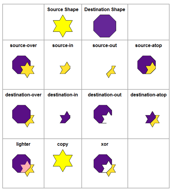source-overdisplays the source (newer) shape over the destination (older) shape unless the source shape is transparent. (This is the default value)source-indisplays only the portion of the source shape that is opaque and overlaps the destination shape. Everything else is transparent.source-outdisplays only the portion of the source shape that does not overlap the destination shape.source-atopdisplays only the portion of the opaque source shape that overlaps the destination shape and the portion of the destination shape that is not covered by the opaque source shape.destination-overdisplays the destination shape over the source shape. In areas where both shapes are opaque and overlap, the older shape displays.destination-indisplays only the portion of the destination shape that is opaque and overlaps the source shape. Everything else is transparent. The source (newer) shape is not visible.destination-outdisplays only the portion of the destination shape that does not overlap the source shape. The source shape is not visible.destination-atopdisplays only the portion of the opaque destination shape that overlaps the source shape and the portion of the source shape that is not covered by the opaque destination shape.lighterdisplays both the source and destination shapes. Where the shapes overlap, the their color values are added, producing a lighter color.copydisplays only the source shape. The destination shape is ignored.xordisplays both the source and the destination shapes except the areas of overlap, in which both shapes are completely transparent.