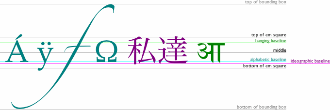 textBaselinespecifies the position at which text is drawn relative to a baseline. The figure below, from HTML5 Canvas API, illustrates the possible values for thetextBaselineattribute:topis the top of the em square, which approximates the top of the glyphs in a fonthangingspecifies a hanging baseline, where the tops of some glyphs are anchored.middleis the mid-point of the em squarealphabetic(default) is the anchor point of many alphabetic charactersideographicis the anchor point of many ideograms, such as the characters used in the writing systems of many Asian languagesbottomis the bottom of the em square