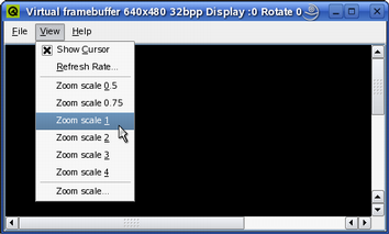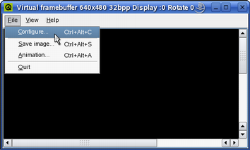 The File menu allows the user to configure the virtual framebuffer display (File|Configure...), save a snapshot of the framebuffer contents (File|Save Image...) and record the movements in the framebuffer (File|Animation...).