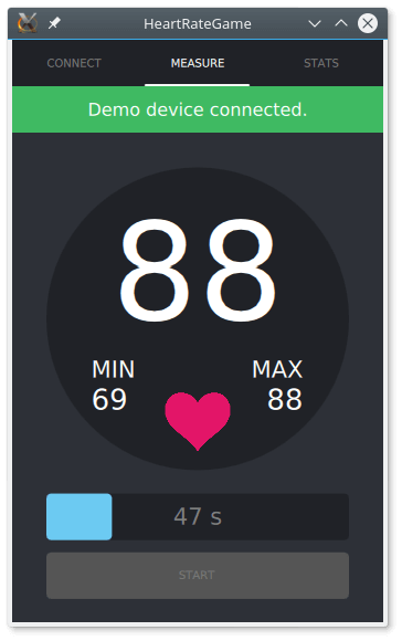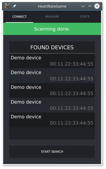 The Bluetooth Low Energy Heart Rate Game shows how to develop a Bluetooth Low Energy application using the Qt Bluetooth API. The application covers the scanning for Bluetooth Low Energy devices, connecting to a Heart Rate service on the device, writing characteristics and descriptors, and receiving updates from the device once the heart rate has changed.