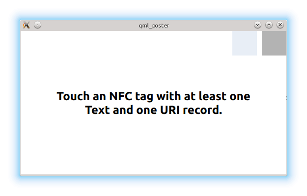 The QML Poster example displays the contents of specifically formatted NFC Data Exchange Format (NDEF) messages read from an NFC Tag. The NDEF message must contain a URI record, an optional image/* MIME record, and one or more localized Text records.