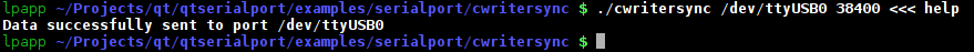Command Line Writer Sync shows how to use the QSerialPort class for sending data synchronously over the selected serial port with the desired settings.