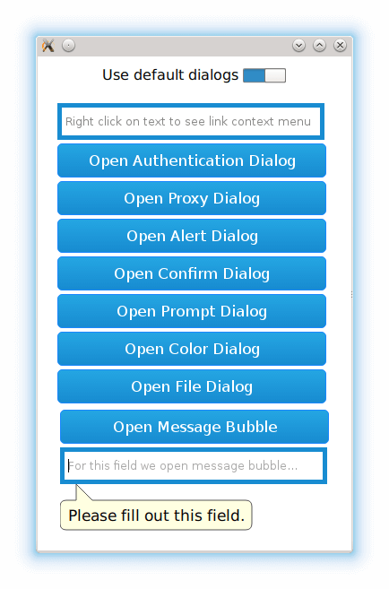 Custom Dialogs demonstrates how to use WebEngine dialog request objects to implement custom dialogs for use instead of the default dialogs.