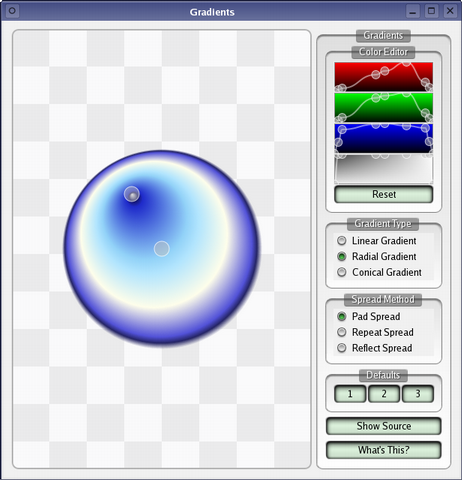 The panel on the right contains a color table editor that defines the colors in the gradient. The three topmost controls determine the red, green and blue components while the last defines the alpha of the gradient. You can move points, and add new ones, by clicking with the left mouse button, and remove points by clicking with the right button.