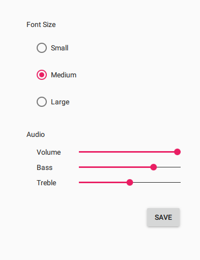 import QtQuick 2.12 import QtQuick.Controls 2.12 import QtQuick.Controls.Material 2.12 ApplicationWindow { visible: true Material.theme: Material.Dark Material.accent: Material.Purple Column { anchors.centerIn: parent RadioButton { text: qsTr("Small") } RadioButton { text: qsTr("Medium"); checked: true } RadioButton { text: qsTr("Large") } } } |