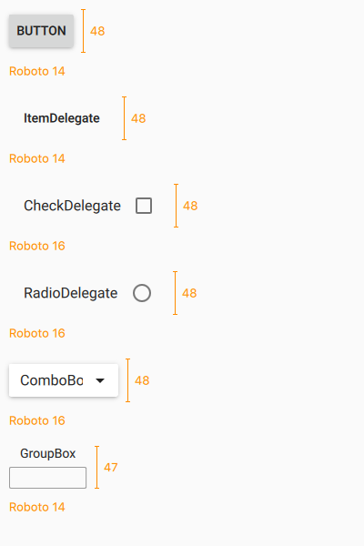 The Material style also supports a dense variant, where controls like buttons and delegates are smaller in height and use smaller font sizes. It is recommended to use the dense variant on desktop platforms, where a mouse and keyboard allow more precise and flexible user interaction.