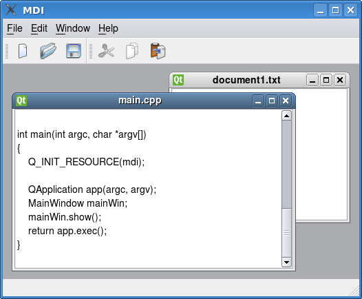 The MDI example shows how to implement a Multiple Document Interface using Qt's QMdiArea class.