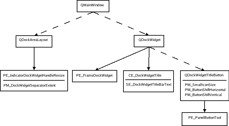 The dotted lines indicate that the sender keeps instances of the recipient of the arrow (i.e., it is not a style element to draw). The dock widget only draws PE_frameDockWidget when it is detached from its main window (i.e., it is a top level window). If it is docked it draws the indicator dock widget resize handle. We show a dock widget in both docked and floating state in the plastique style: