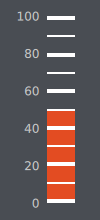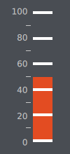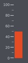 import QtQuick 2.2 import QtQuick.Controls 1.4 import QtQuick.Controls.Styles 1.4 import QtQuick.Extras 1.4 Rectangle { width: 100 height: 220 color: "#494d53" Gauge { value: 50 tickmarkStepSize: 20 minorTickmarkCount: 1 font.pixelSize: 15 anchors.centerIn: parent anchors.horizontalCenterOffset: -4 style: GaugeStyle { valueBar: Rectangle { color: "#e34c22" implicitWidth: 28 } foreground: null tickmark: Item { implicitWidth: 8 implicitHeight: 4 Rectangle { x: control.tickmarkAlignment === Qt.AlignLeft || control.tickmarkAlignment === Qt.AlignTop ? parent.implicitWidth : -28 width: 28 height: parent.height color: "#ffffff" } } minorTickmark: Item { implicitWidth: 8 implicitHeight: 2 Rectangle { x: control.tickmarkAlignment === Qt.AlignLeft || control.tickmarkAlignment === Qt.AlignTop ? parent.implicitWidth : -28 width: 28 height: parent.height color: "#ffffff" } } } } }